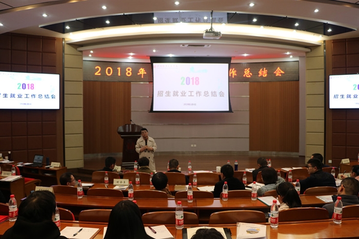 (招生就业处通讯员 余爽)1月9日下午,我院2018年招生就业总结会在正德楼罗山厅举行。本次会议的主题为“大数据时代的精准提质之道”。学院副院长王志梅,教务处、学生处、宣传部负责人,各系(二级学院)主任(院长)、党总支书记、专业负责人、学工办主任,招生就业辅导员,招生就业处全体成员参加了会议。