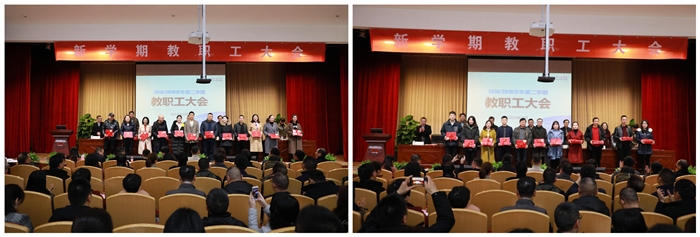 会上,党委副书记夏晓军宣读了《关于表彰学院2018年度考核优秀部门和单项奖的通知》、《关于表彰学院2018年度优秀中层干部的通知》、《关于表彰学院2018年度考核个人优秀的通知》、《温州职业技术学院2018年度特殊贡献奖》等表彰文件。主席台领导为2018年度考核优秀和单项奖获得部门、2018年度优秀中层干部、2018年度考核个人优秀代表、2018年度特殊贡献奖等获奖代表颁奖。