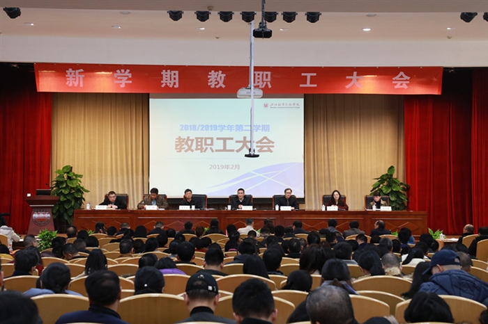 本网讯 2月24日,学院召开新学期教职工大会,学院党委书记王靖高主持大会并讲话,院长方益权作新学期开学报告。学院党政领导班子成员、全体教职工参加了会议。