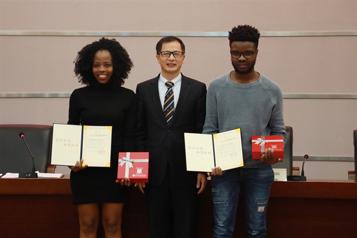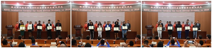 结业典礼上,院领导和嘉宾一同为留学生们颁发了结业证书并赠送学校特色纪念品。留学生代表维克多和艾米丽在现场还被学院聘任为温州职业技术学院南非校友联络人,鼓励他们秉承温职人“厚德长技,励学敦行”的精神,凝聚在南非的校友们,推进温职院海外校友工作发展。
