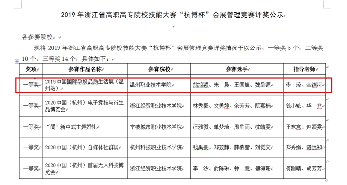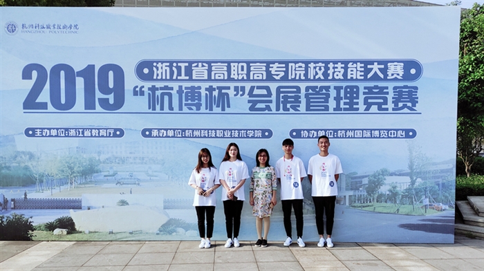 本网讯 (工商系通讯员 叶侨成) 4月26日-27日,由浙江省教育厅主办的2019年浙江省高职高专院校“会展管理”技能大赛在杭州科技职业技术学院举行。我院工商管理系学子在竞赛中表现出色,参加竞赛的三支团队全部获奖,揽下一项一等奖,两项二等奖。其中,由李琼、金浏河老师带队指导的学生翁旭颖(酒店1601)、朱晨(酒店1802)、王国旗(酒店1802)、魏呈源 (酒店1802)荣获团队一等奖,位列所有参赛队伍第一名。该团队新颖的选题、出色的表现获得评委的一致认可。