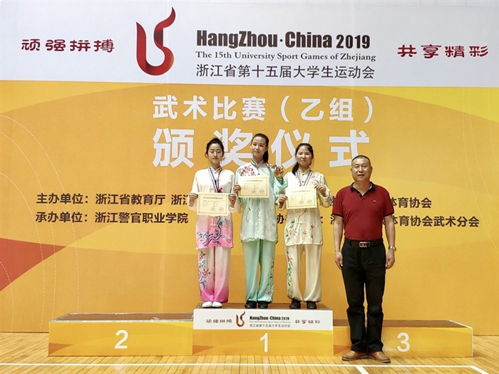 据悉,本次比赛由浙江省教育厅、浙江省体育局主办,共吸引了全省19所高职院校、152名运动员参赛。温职院此次共派出10名学生运动员参加比赛。其中,许艳娇同学一人揽下双冠,在女子自选太极拳、42式太极剑两个项目中均荣登冠军宝座;叶俊获得男子42式太极剑第一名。宋春文获得男子自选太极拳第二名、男子42式太极剑第二名;吴萍获得女子自选南拳第二名、女子自选刀术第三名;王双燕获得女子自选长拳第二名;戚浩杰获得男子自选棍术第二名;黄文静获得女子自选太极拳第三名、女子42式太极剑第三名;蔡志琪获得男子自选南拳第三名。