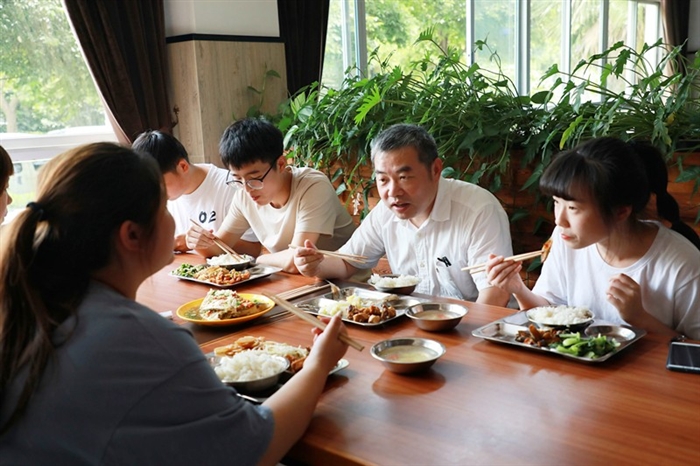 课后,徐利群还受邀与同学们一起吃午餐。在朝阳餐厅一楼,徐利群与同学一起排队打饭,一同坐在共进午餐,一起聊起了食堂卫生、饭菜价格,还聊起了家乡的“味道”。不同年龄的“同学”围在一起,其乐融融。
