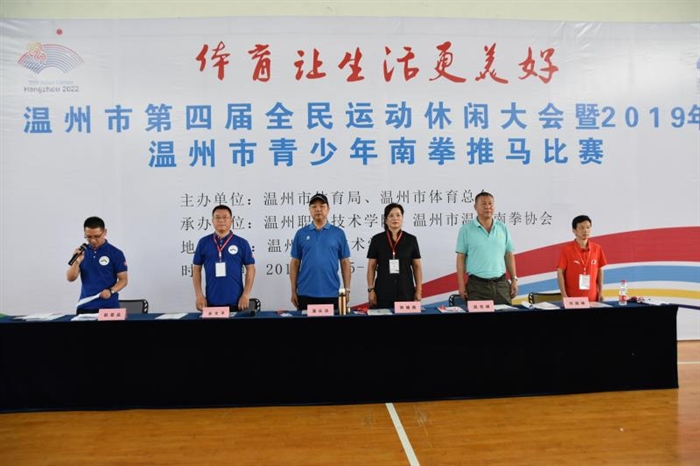 本网讯 (公共教学部通讯员 王品)为深入挖掘温州民间传统体育文化,打造地方特色的高校体育校园文化品牌,6月16日上午,由温州市体育局、温州市体育总会主办,温州职业技术学院、温州市温州南拳协会承办的温州市第四届全民运动休闲大会2019温州市青少年南拳推马比赛在我院体育馆开幕。