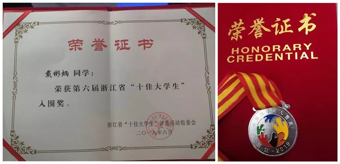 6月29日下午,第六届浙江省“十佳大学生”颁奖典礼在浙江电视台举行。省教育厅党委书记、厅长陈根芳,省委宣传部副部长李杲,省教育厅党委副书记干武东,团省委副书记周苏红、省广电集团编委许东良等出席活动并颁奖。经高校推荐、初评、在校大学生投票、网络点赞、专家投票等环节,共评选出第六届浙江省“十佳大学生”10名和入围奖20名。我院戴彬炳同学脱颖而出,荣获入围奖,并受到了现场表彰。