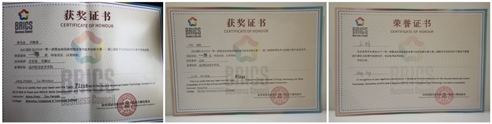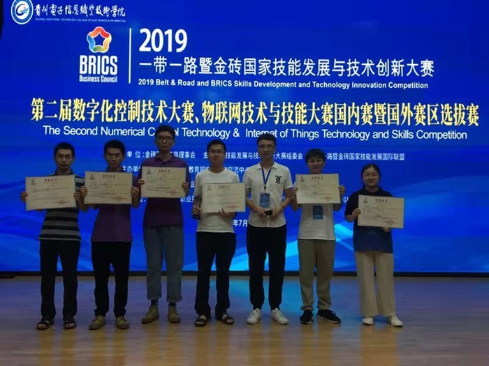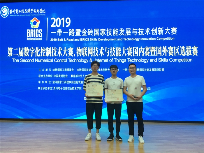 本网讯 7月8日至11日,2019年“一带一路”暨金砖国家技能发展与技术创新大赛——第二届物联网技术与技能大赛、数字化控制技术大赛国内赛暨国外赛区选拔赛在贵州信息电子职业技术学院举行。我院派出了三支队伍参赛,揽下了两个一等奖,一个二等奖,全部获得了进军今年9月份举办的2019第三届金砖大赛中国赛区赛(国际赛)的资格,成为赛场中最大的“赢家”。王锋、王哲禄、邹鹏达三名指导教师还荣膺“优秀指导教师”称号。