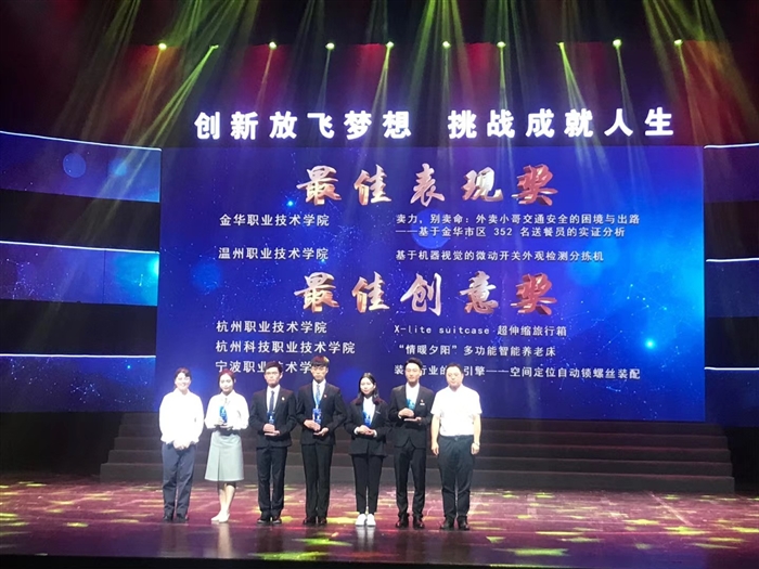 本网讯 (团委通讯员 吕志远)可自动伸缩调整容量的旅行箱;能代替人眼,自动检测微动开关外观质量并剔除不合格品的分拣机;集休闲阅读、锻炼养生、陪护等功能于一身的多功能智能养老床……10月20日,浙江省第七届职业院校“挑战杯”创新创效竞赛在金华收官。我院选送的项目成绩取得历史性突破,共斩获特等奖2项、一等奖4项、二等奖2项、三等奖4项、最佳表现奖1项,同时荣获“优秀组织奖”。
