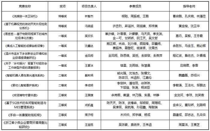 由电气电子工程系黄金梭、沈正华三位老师指导,冯英超、许忠烈、麻溢洲等同学的作品《基于机器视觉的微动开关外观检测分拣机》和机械工程系曹启鹏、孔庆晓、林潘忠三位老师指导,林智杰、胡聪、周振威、王鹏同学的作品《洗擦按一体卫浴机》作品荣获特等奖。黄金梭老师指导的团队在众多参赛团队中脱颖而出,成为5支参加公开答辩队伍之一,还被评选为荣获最佳表现奖。