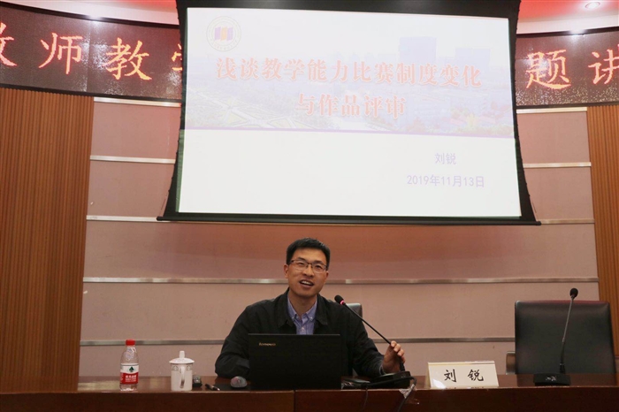 随后,刘锐老师做了《浅谈教学能力比赛制度变化与作品评审》的讲座,对职业院校技能大赛教学能力比赛背景、赛项内容、比赛新政策进行了详细的解读,语言表达精炼,有很强的针对性和实用性,对我院教师如何准备教学能力比赛具有十分重要的指导意义。