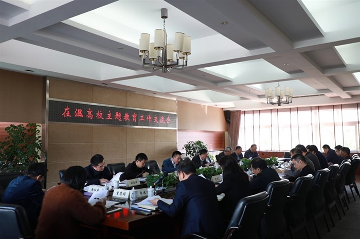 本网讯 (组织部通讯员 刘笑傲)11月19日下午,在温高校“不忘初心、牢记使命”主题教育工作交流会在我院正德楼301会议室召开。浙江省委主题教育第十五巡回指导组组长刘剑虹及全体成员出席会议,温州医科大学、温州大学、温州职业技术学院、浙江工贸职业技术学院、温州科技职业学院、浙江安防职业技术学院等六所高校分管主题教育工作的党委副书记、组织部长参加会议。会议由指导组副组长吴金良主持。