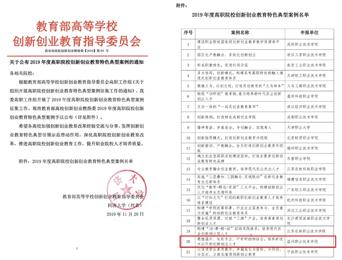 本网讯 (产教融合处通讯员 吴牧潇)近日,教育部高校创新创业教指委公布了2019年度高职院校创新创业教育特色典型案例名单,我校申报的《根植温州、依托产业、产学研创相结合,培养新技术应用的创新创业人才》案例成功入选。