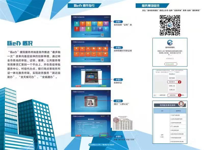 据悉,“瓯e办”便民服务终端将审批、证明、缴费、公共服务等常用事项汇聚在一个平台上。市民凭身份证或“刷脸”认证即可办理相关事项的便民服务终端机,目前可办理142个事项,覆盖审批、证明、社保、住房、交通等10个方面的民生事务。去年以来,温州按照省委省政府推进“最多跑一次”改革的决策部署,积极探索创新,率先推出了一站导引、一网通办、一库共享、一端服务“四个一”创新工程,建成了公安“百万申请网上办”等一批便民服务平台,获得了广大市民群众的一致好评。