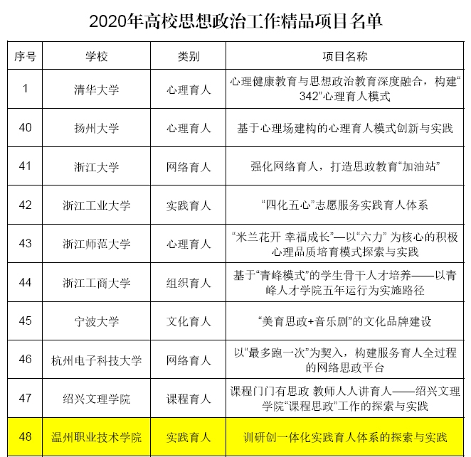 本网讯 (科研处通讯员 陈莉敏)1月8日,教育部公布了2020年度高校思想政治工作精品项目遴选结果,我院申报的——“训研创一体化实践育人体系的探索与实践”获批实践育人类项目,是浙江省唯一入选的高职院校。此前,全国仅三所高职院校获批高校思想政治工作精品项目。