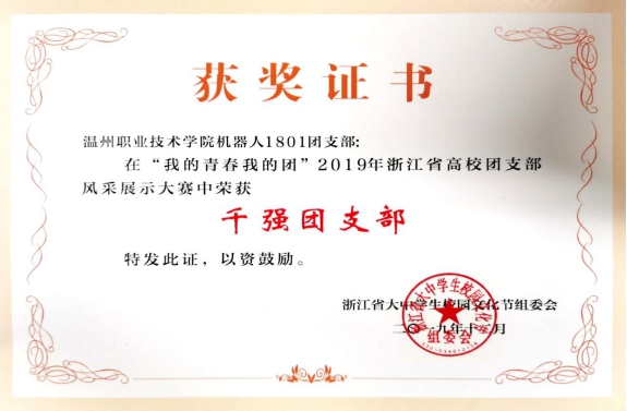 本网讯 (电气系通讯员 巩彦平)近日,“我的青春我的团”2019年浙江省高校团支部风采展示大赛决赛在浙江工商大学落下帷幕。经过学校选拔、组委会评比和审议,我院电气电子工程系机器人1801班团支部脱颖而出,荣获浙江省“千强团支部”荣誉称号。