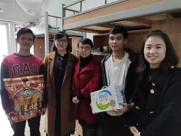 本网讯 (国际教育学院通讯员 陈康豪)在中国新年春节来临之际,为切实关怀寒假期间我院留校留学生,了解他们的生活和学习情况,使其度过一个和谐、健康、快乐的春节。1月13日上午,我院副院长王志梅、国际处副处长武俊梅、电气系相关人员赴留学生公寓走访看望寒假期间留校的留学生,向他们送去学院的关怀和新春的祝福。