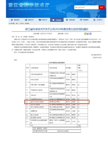 本网讯 (科技开发处通讯员 杨振梅)近日,浙江省科学技术厅公布2019年度优秀众创空间名单,我院温州产业科技众创空间再次名列其中。温州产业科技众创空间是温州市首批市级认定众创空间,曾先后荣获2015年、2018年浙江省优秀众创空间、第三批国家级备案众创空间。
