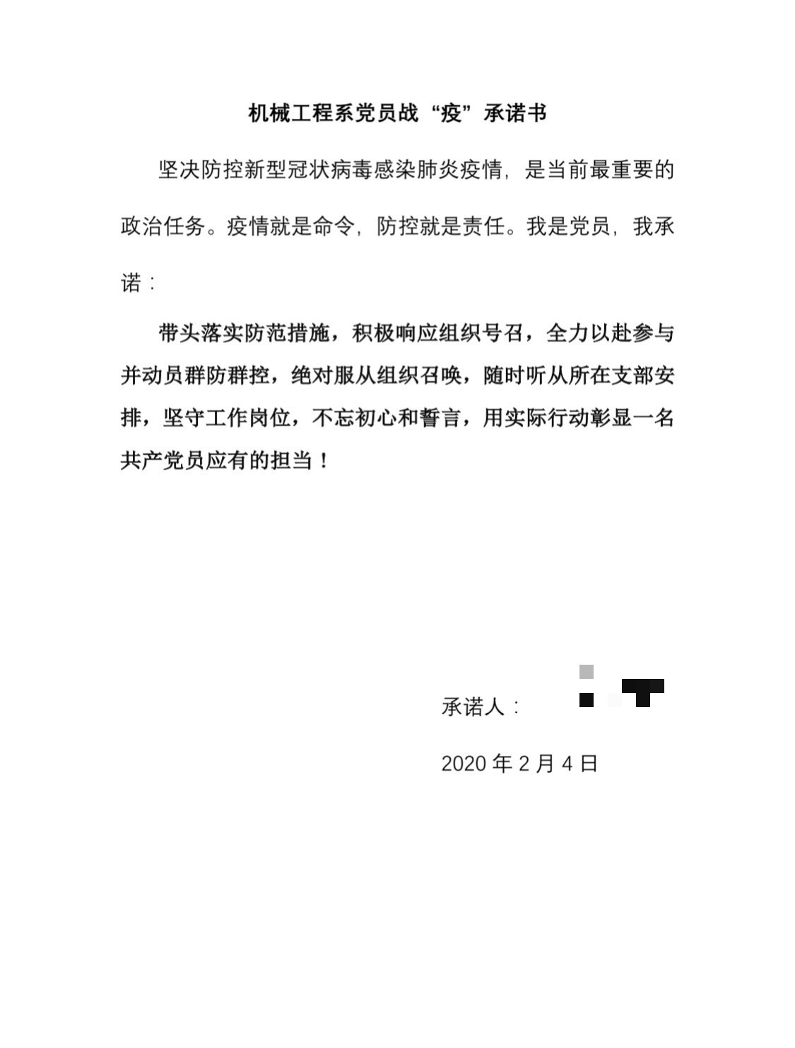机械系党总支书记郑国波表示,坚决防控新型冠状病毒感染肺炎疫情,是当前最重要的政治任务。疫情就是命令,防控就是责任。机械工程系党总支发起“战‘疫’我先行”活动,让党员们进行履责承诺,充分发挥党员的表率作用,党组织的战斗堡垒作用、党员的先锋模范作用,让党旗在疫情防控斗争第一线高高飘扬,让党员在第一线经受锤炼。