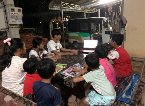 甘术恩采用微信群进行授课,每次正式上课前,他都会事先把制作好的单元PPT内容发到微信群供学生提前自主学习,上课主要以发送语音、PPT模块截图及中英文文字等形式进行互动式教学。留学生KHUN PANHA(潘乾坤)在家中上课,由于是中文课,他的父母、侄子们也经常一起坐到电脑前 “蹭课”。课后,潘乾坤又会当起侄子们的“先生”。