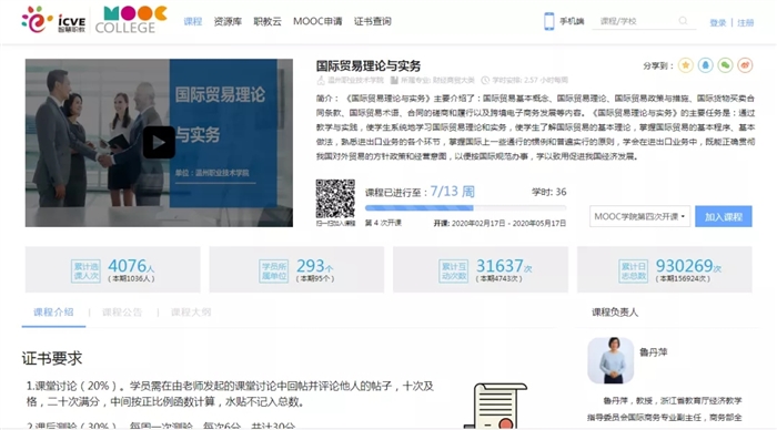 《国际贸易理论与实务》历经5年内容精选、高端制作、平台选择等艰难历程,2018年入选国家级爱课程和智慧职教大学MOOC双平台,为优势专业建设教学模式改革和创新奠定了基础,为教育部推荐的20余个抗疫复课免费社会开放学习平台中全国贸易类核心课程之一。