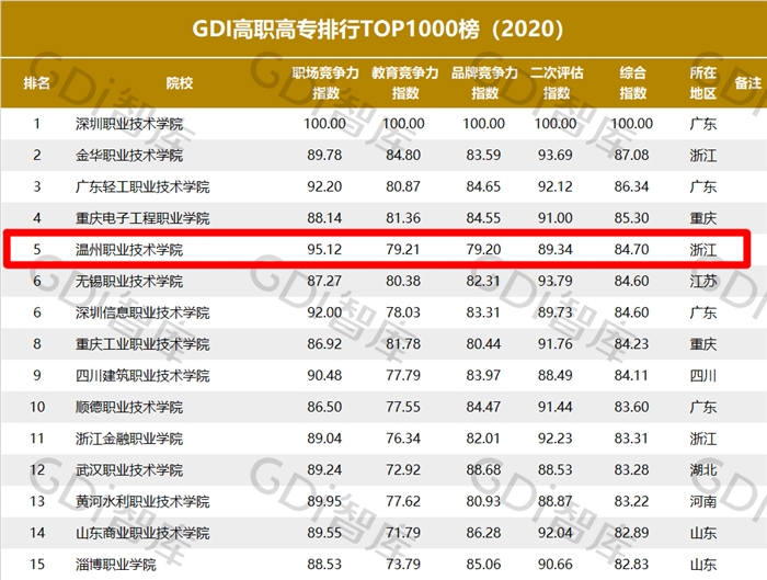 本网讯 4月22日,广州日报数据和数字化研究院(GDI智库)发布“GDI高职高专排行TOP1000榜(2020)”(以下简称“GDI高职高专榜”),以职场竞争力指数、教育竞争力指数、品牌竞争力指数和二次评估指数四个一级指标建构综合指数,科学评价国内1414所高职高专院校,推出“GDI高职高专榜”及五个子榜单。我校位列榜单第5位,创下该榜单位次历史新高,在浙江省高职院校中排行第2名,我校还拿下了榜单中职场竞争力指数第二名。