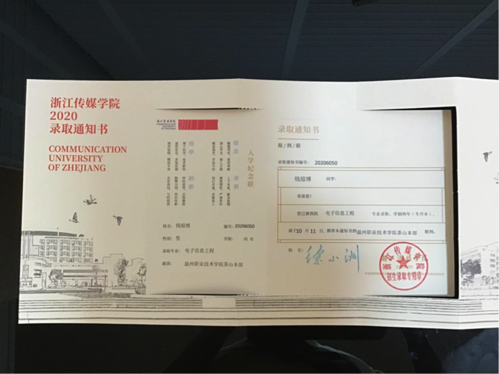 此外,今年7月,他从温州职业技术学院毕业,并以优异的成绩考取了浙江传媒学院电子信息工程专业。