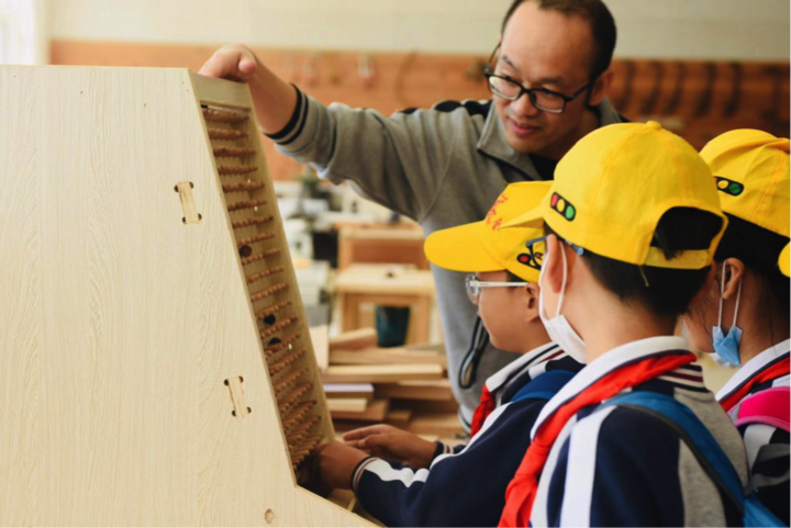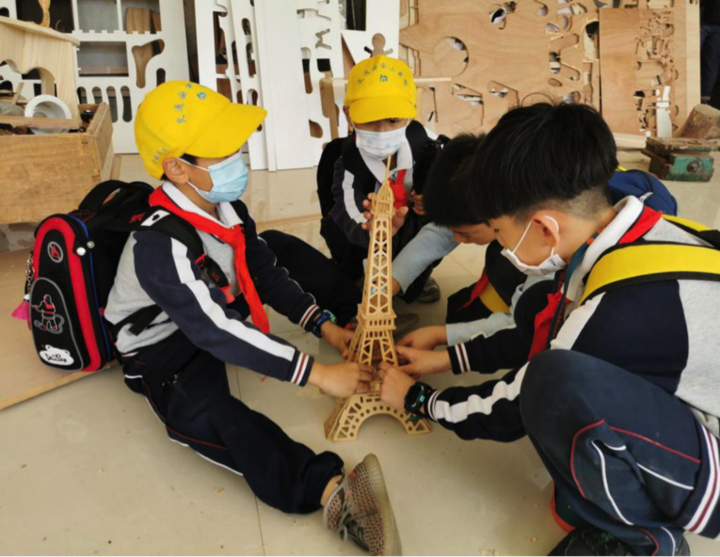 在家具设计与制造专业劳动实践基地,小朋友们参观各类创意家具,观看家具设计与制作的视频,同时体验了家具设计师职业。