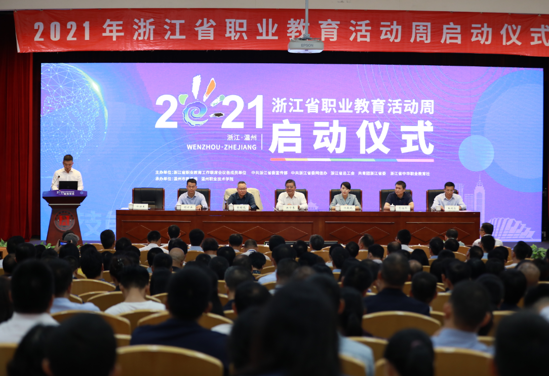 • 5月23日下午,2021年浙江省职业教育活动周启动仪式在温州职业技术学院隆重举行。教育部职业教育与成人教育司、浙江省教育厅职成教处相关负责人,温州市政府相关领导、职业教育改革发展工作专班成员单位负责人、在温高职院党政领导等,以及部分行业企业代表共500余人到场参加活动。本次活动通过网络同步互动直播。