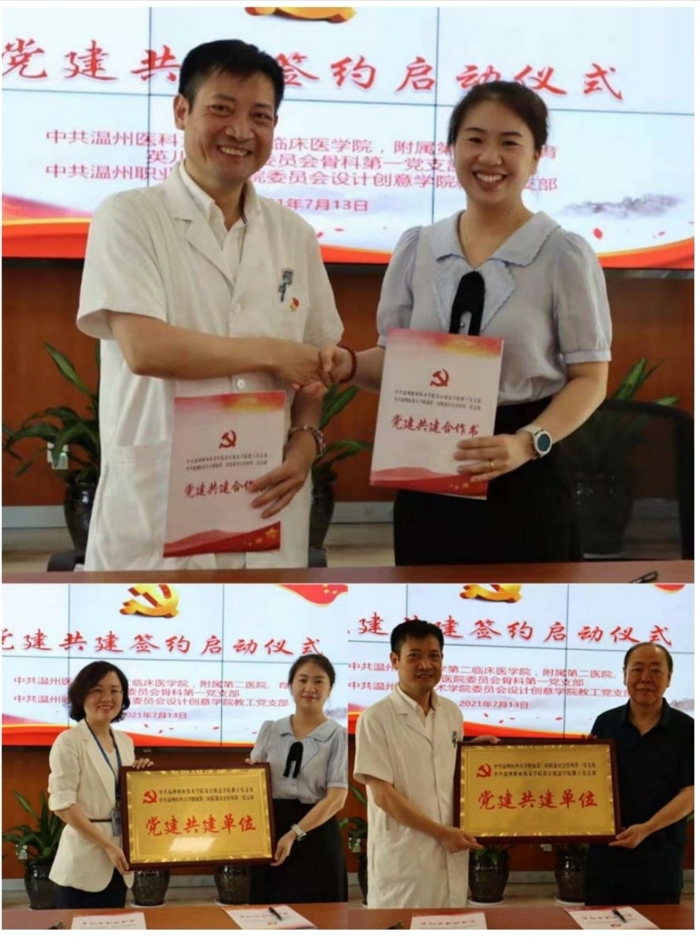 本网讯(设计创意学院通讯员 宋芯铭)7月13日,设计创意学院教工党支部与温州医科大学第二临床医学院附属第二医院第一党支部党建共建签约启动仪式在附属第二医院(瓯江口院区)门诊三楼会议室举行。本次活动以支部理论同学、组织同建、品牌同筑、服务同行、技术互助、成效同享、党建品牌联创为主要内容。
