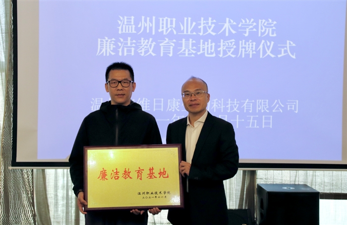 本网讯(纪检室通讯员 程红波)11月15日下午,我校与维日康生物科技有限公司举行合作共建廉洁教育基地授牌仪式。校纪委书记蔡后界,维日康公司董事长王贤俊、副总经理林祯乐,我校纪委委员,相关处室负责人,二级学院党总支负责人、纪检委员等近30人参加仪式。