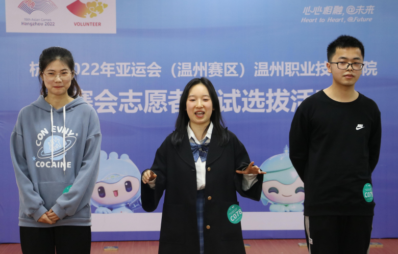 “同学们表现得都很好,看得出来为了今天的面试都做了精心准备,给你们一个大大的赞。”日前,在2022年杭州亚运会(温州赛区)温州职业技术学院赛会志愿者面试选拔活动现场,评委对学生给予高度评价。