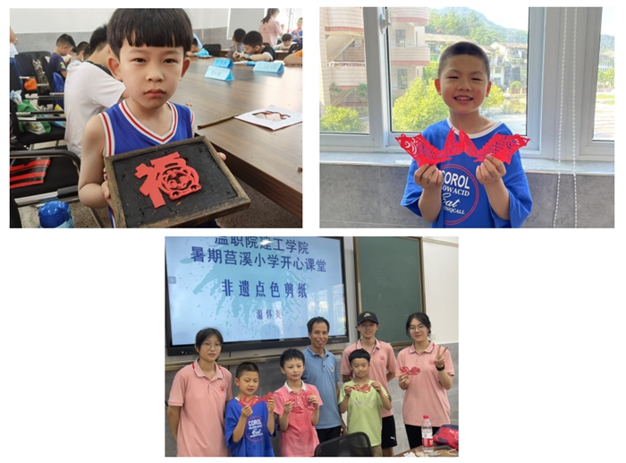 本网讯(建筑工程学院通讯员 施宏余)7月9日,建筑工程学院暑期实践队组织开展非遗文化进校园活动,特邀浙江省非遗点色剪纸项目代表性传承人温怀炎走进苍南莒溪小学,为孩子们讲授剪纸知识并指导他们创作剪纸作品。