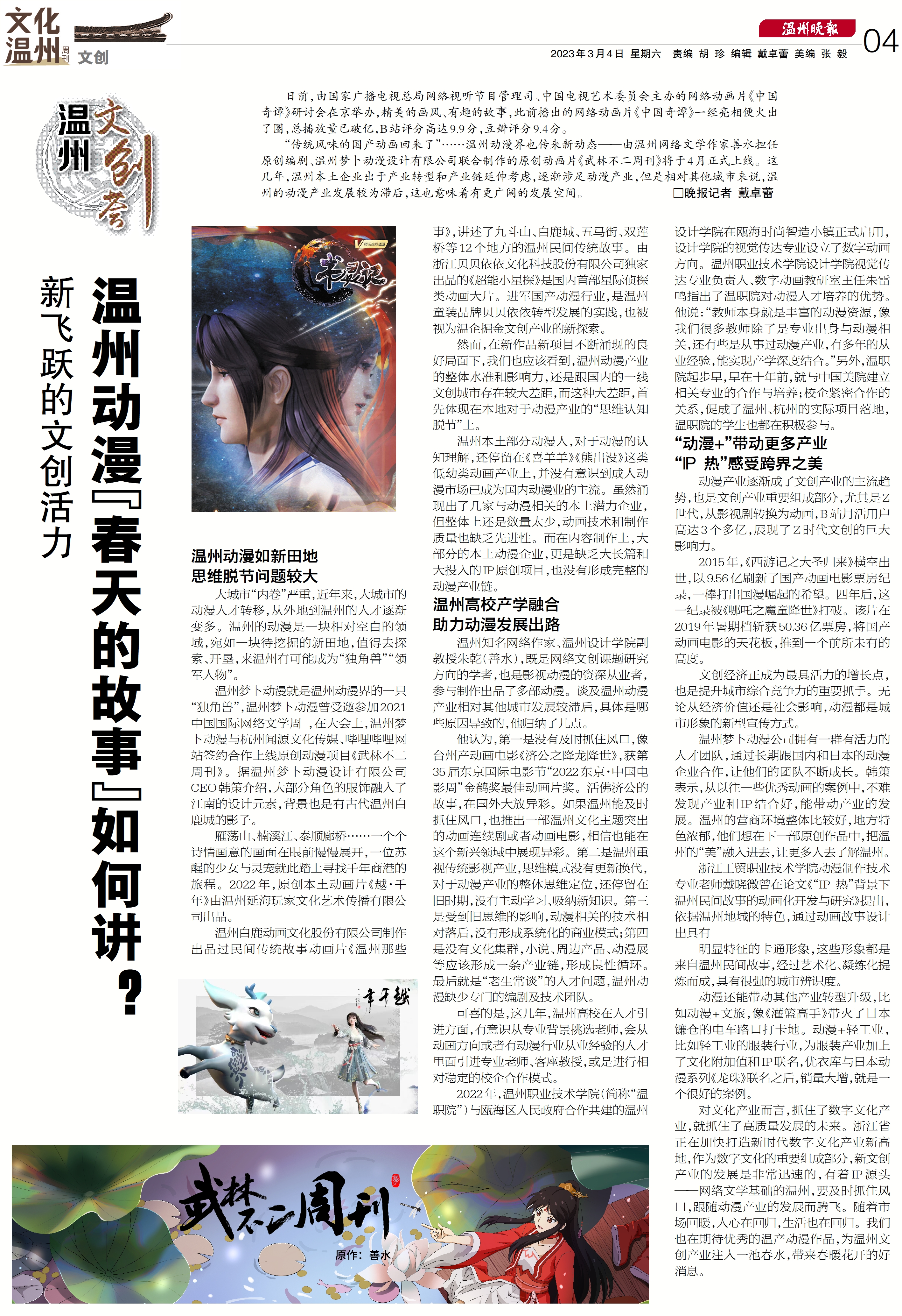 “传统风味的国产动画回来了”……温州动漫界也传来新动态——由温州网络文学作家善水担任原创编剧、温州梦卜动漫设计有限公司联合制作的原创动画片《武林不二周刊》将于4月正式上线。这几年,温州本土企业出于产业转型和产业链延伸考虑,逐渐涉足动漫产业,但是相对其他城市来说,温州的动漫产业发展较为滞后,这也意味着有更大更广阔的发展空间。