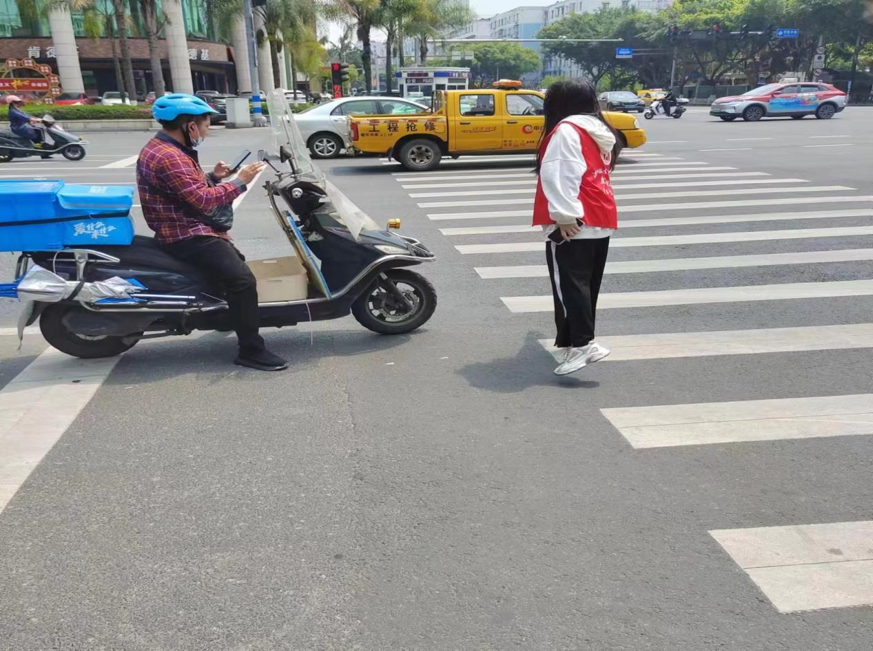每周活动通知一发布,学生踊跃报名,名额被一抢而空。报名成功的志愿者根据安排,身着统一红马甲,在早晚高峰时段分别到建行路口、时代广场路口等交通繁忙处站岗。他们劝导行人过马路遵守交通规则,在指定区域等待交通信号灯;引导电瓶车、摩托车车主自觉规范戴头盔;耐心回答他人问路等。不论刮风下雨,志愿者们都坚持到岗,减轻交警疏导的工作压力,让“文明出行”深入人心。