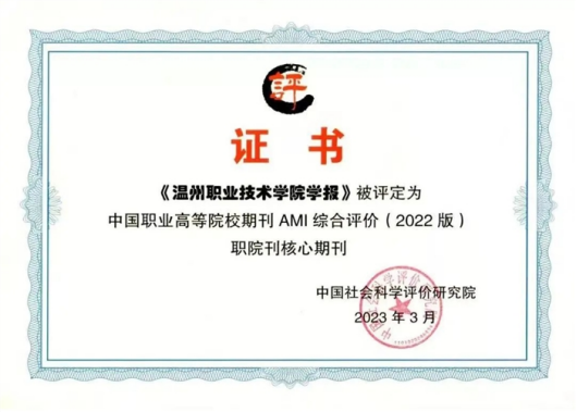 近日,中国社会科学评价研究院公布了《中国职业高等院校期刊AMI综合评价报告(2022年)》,《温州职业技术学院学报》进入14种“中国职业高等院校期刊AMI综合评价”核心期刊行列,是浙江省唯一入选期刊。
