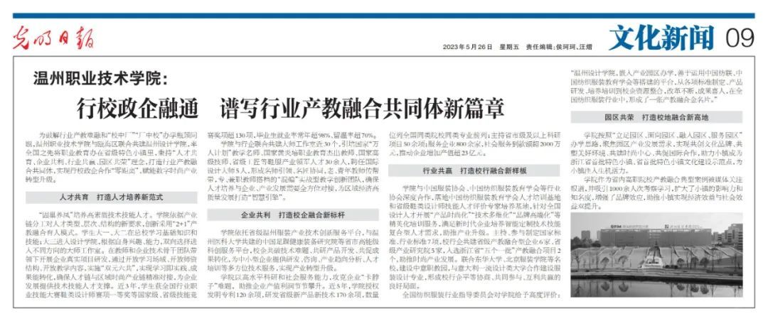 • 5月26日,《光明日报》刊登了《温州职业技术学院:行校政企融通 谱写行业产教融合共同体新篇章》的文章,原文如下: