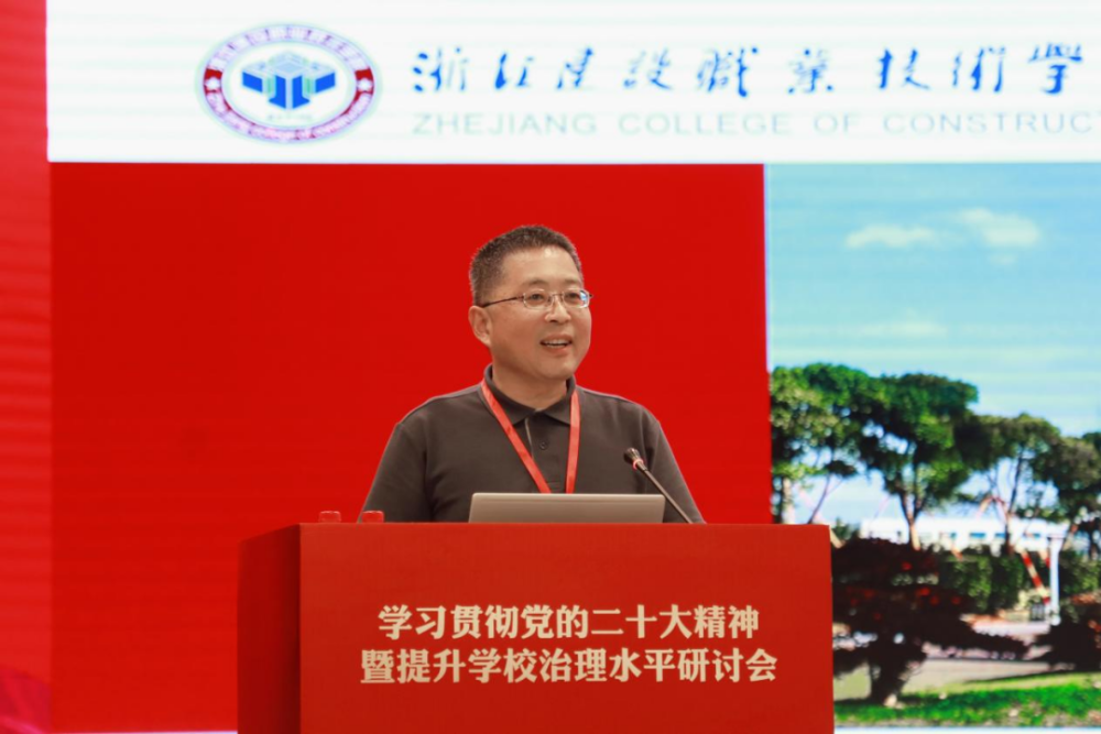 浙江建设职业技术学院党委书记李明以《党建引领 推进学校治理现代化》为题,指出加快高职院校治理体系和治理能力现代化,构建完善科学合理的现代大学治理体系是学校高质量发展的根本保障,是“双高校”建设的必然要求,并从“聚焦党建引领,夯实学校治理基础”“聚焦以群建院,促进治理模式变革”“聚焦一校三区,理顺治理结构体系”“聚焦数字改革,助力智慧治理升级”“聚焦服务发展,推进治理效能提升”分享学校加强治理体系和治理能力现代化建设的经验。