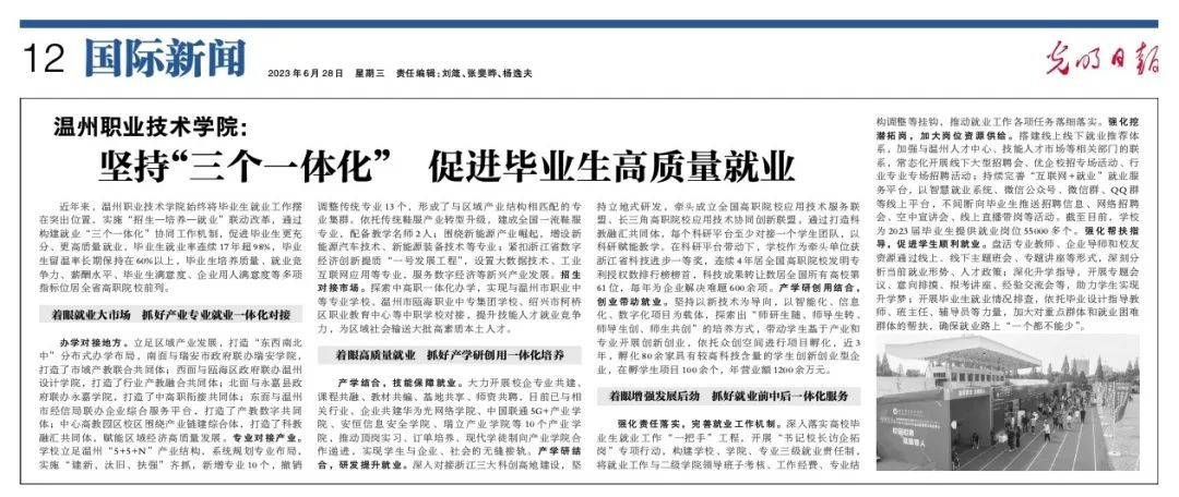 6月28日,《光明日报》刊发温州职业技术学院文章《坚持“三个一体化” 促进毕业生高质量就业》,原文如下: