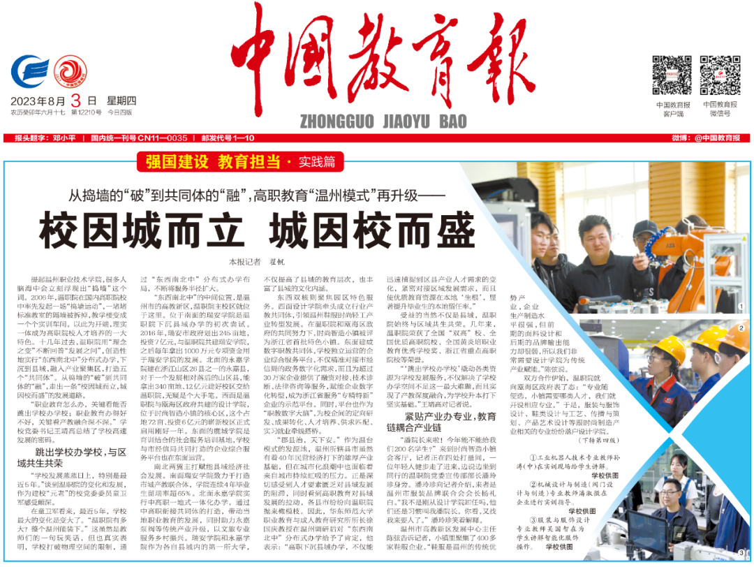 8月3日,《中国教育报》头版头条刊发《从捣墙的“破”到共同体的“融”,高职教育“温州模式”再升级——校因城而立 城因校而盛》,点赞温职院办学先进做法,全文如下。