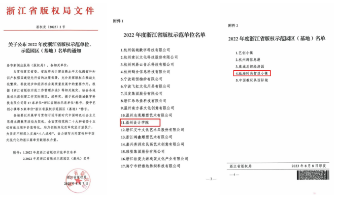 本次评选结合各地版权示范创建工作实际情况,经研究,最终确定了17家省版权示范单位和5家省版权示范园区(基地),温职院设计学院(温州设计学院)是本批次唯一入选的高校单位。