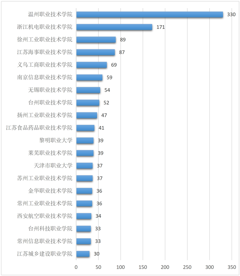 对全国高职院校专利转让人和转让量进行统计分析,温州职业技术学院以 330 件专利转让量排名第一;排名第二的是浙江机电职业技术学院,专利转让量 171 件;排名第三的是徐州工业职业技术学院,专利转让量 89 件。