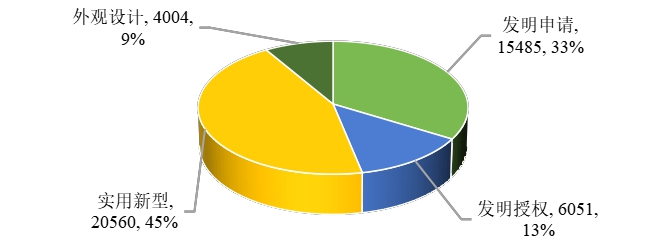 全国高职院校专利类型分布图。摘自《报告》