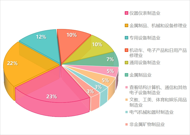 全国高职院校专利技术对应国民经济行业分类中,仪器仪表制造业的专利数量最多,达 22734 件;其次是金属制品、机械和设备修理业,专利数量 21557 件;第三是专用设备制造业,专利数量 12318 件。此外,依次是机动车、电子产品和日用产品修理业、通用设备制造业等。