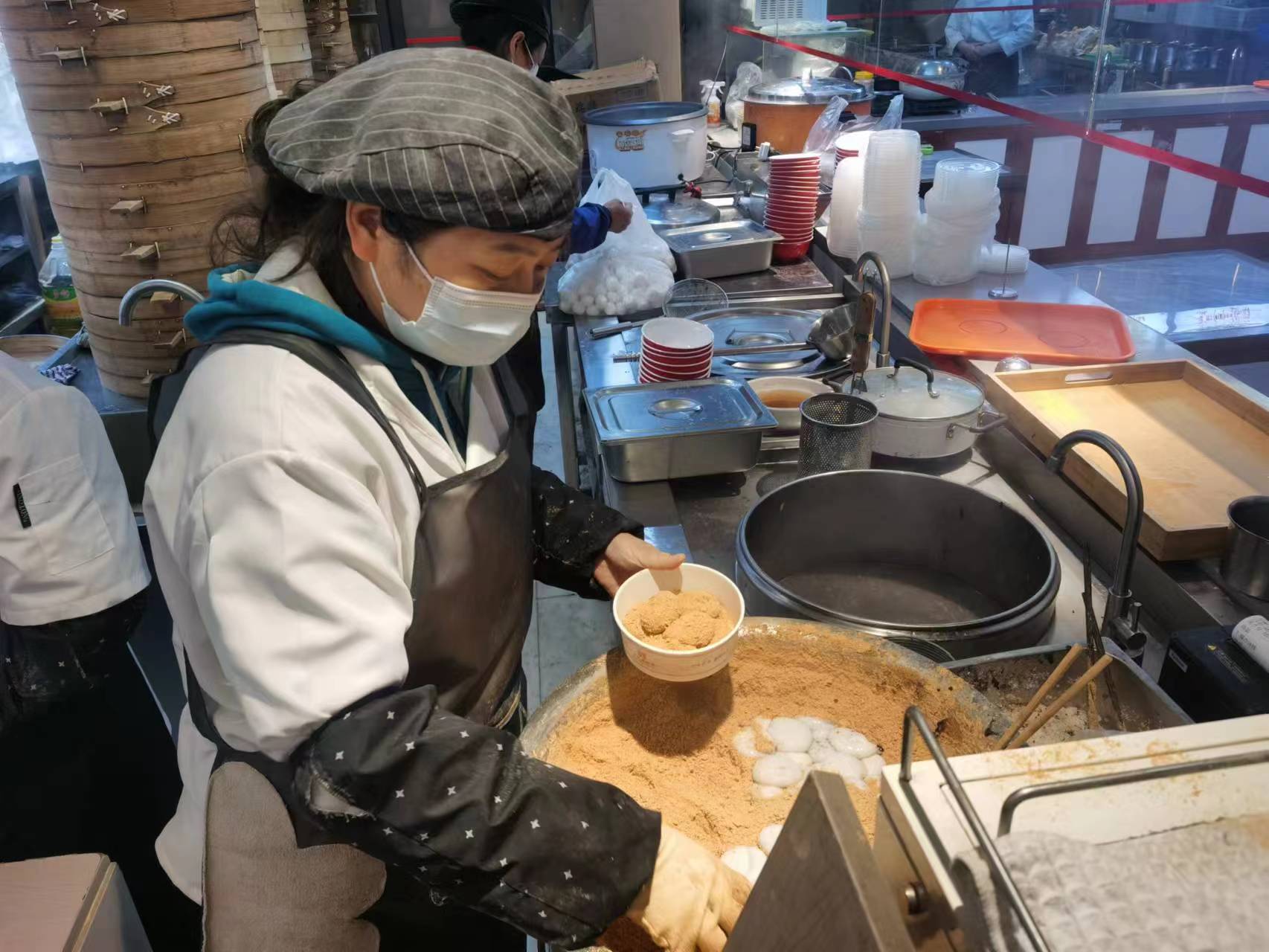 “老板,给我打包一份擂沙汤圆!”漏勺一捞,手腕一抖,圆溜的汤圆一溜串滚进了沙沙的黄豆粉中。一转、一晃、一摇,洁白的汤圆均匀沾满了黄豆粉,一份经典的擂沙汤圆就完成了。12月21日下午3点,记者来到县前汤圆店(县前头店),复古的招牌下,购买汤圆的市民已经排到了店门之外。