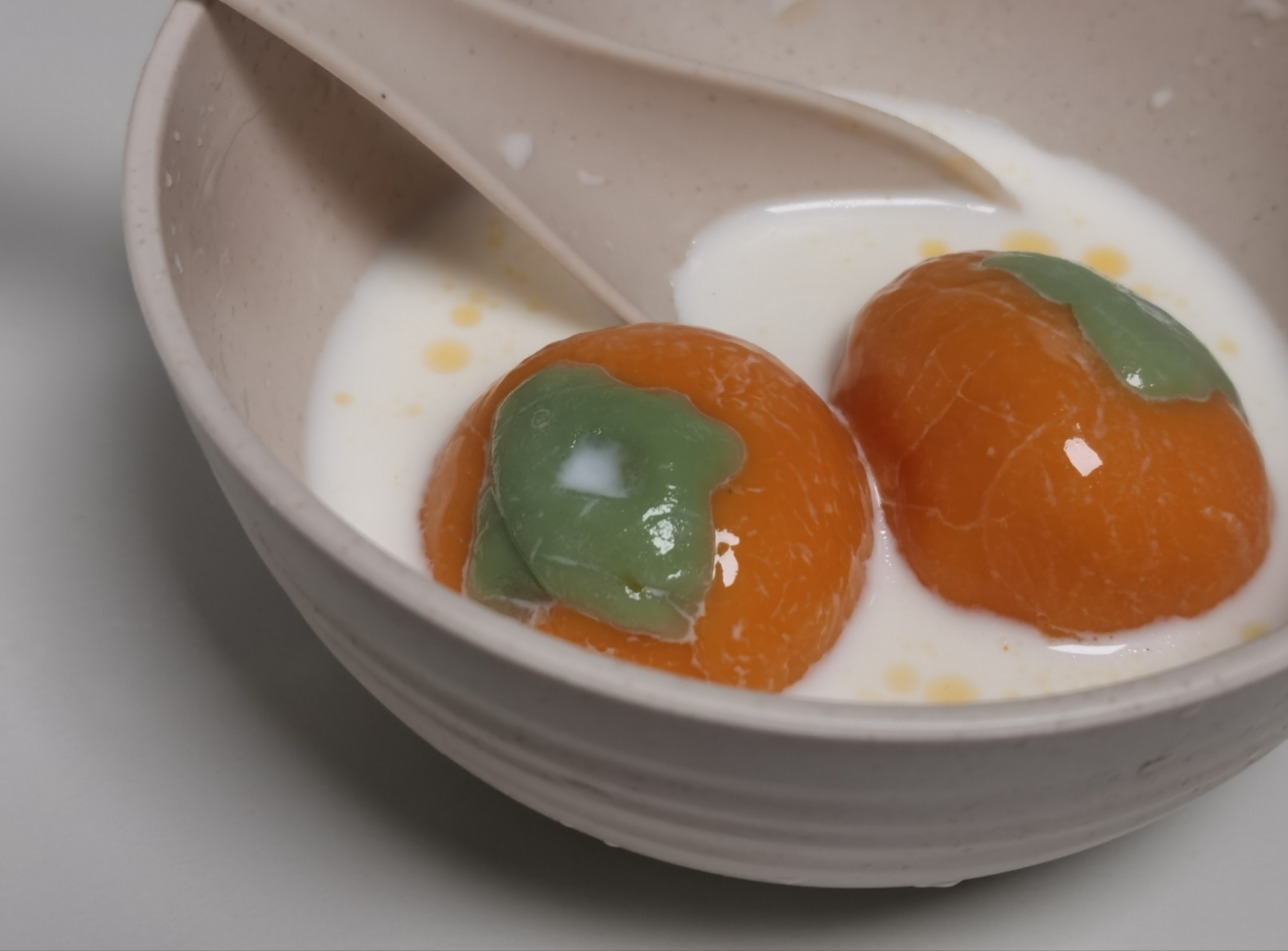 除了经典款,许多花式汤圆也走进了市民的视线。一周前,合德记甜品店新推出网上极为流行的“柿柿如意汤圆”。胡萝卜汁掺成的橘色汤圆皮裹着黑芝麻芯,上面再盖上油绿的“叶子”,“柿柿如意”汤圆几乎可以以假乱真。