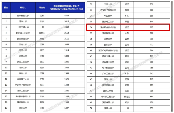 近日,全球知识产权综合信息服务提供商IPRdaily与incoPat创新指数研究中心联合发布“中国高校专利转让排行榜(TOP100)”,温州职业技术学院以转让数量827件位列全国高校(包含普通本科高校)第36、全国高职院校第1,首次挺进全国50强,创历史新高。