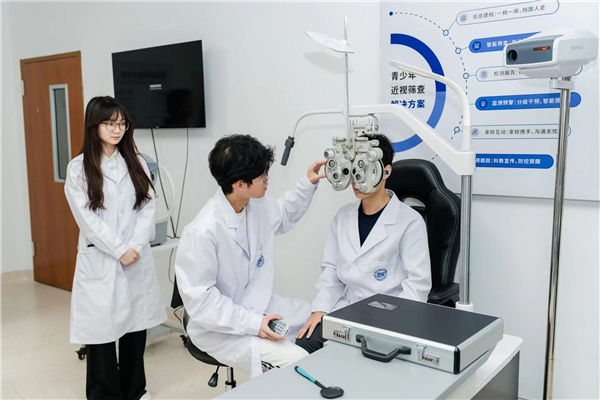 图为浙江工贸职业技术学院学生利用设备对眼睛视力进行检测。
