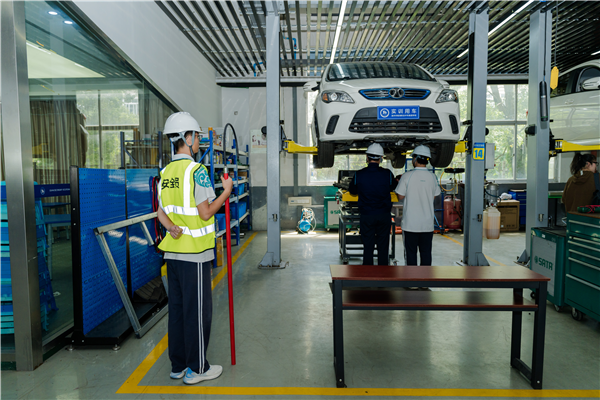 图为温州市瓯海职业中专学生对车辆进行检修