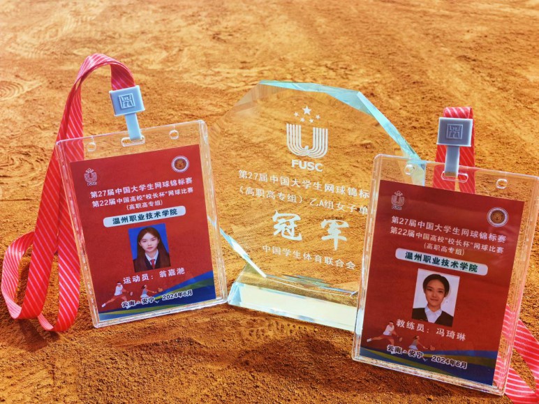 近日,第27届中国大学生网球锦标赛(高职高专组)在云南省安宁市举行。来自温州职业技术学院设计学院视传2301班的翁嘉滟在公共基础学院冯琦琳老师的带领下斩获女子单打全国冠军,创该校球类项目国赛历史最好成绩。