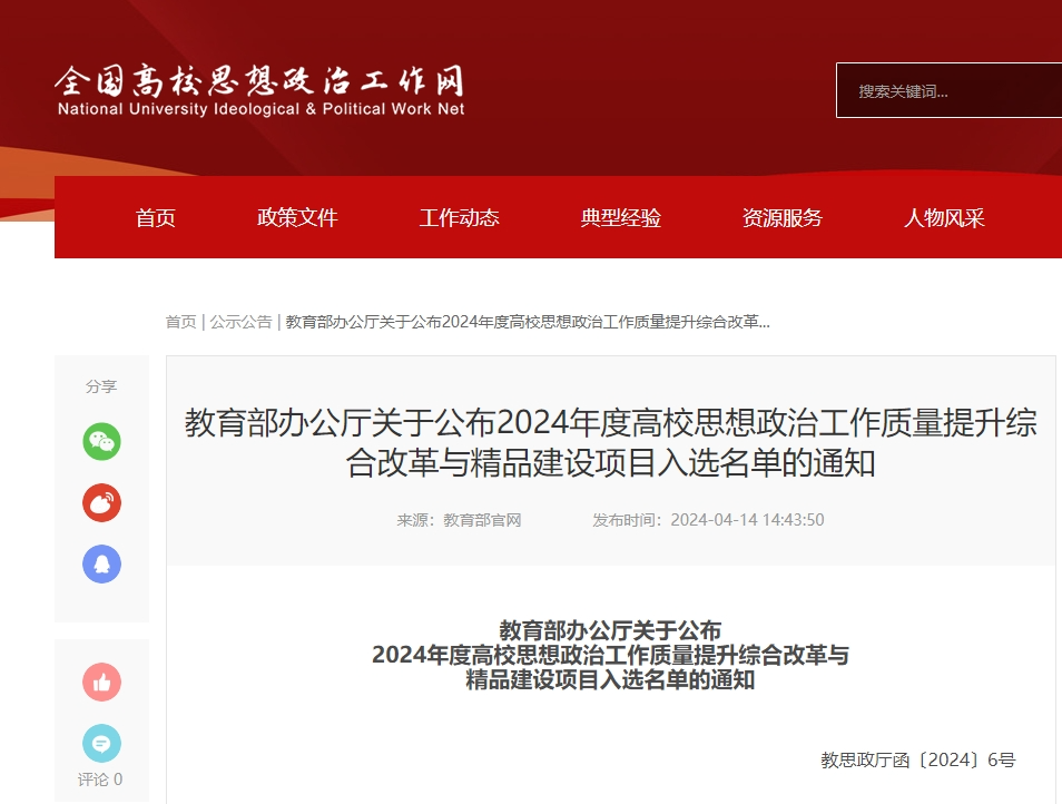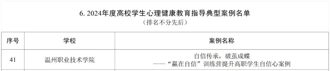 近日,教育部办公厅公布了2024年度高校思想政治工作质量综合改革与精品建设项目入选名单。温州职业技术学院公共基础学院《自信传承,破茧成蝶——“赢在自信”训练营提升高职学生自信心案例》成功入选高校学生心理健康教育指导典型案例名单。