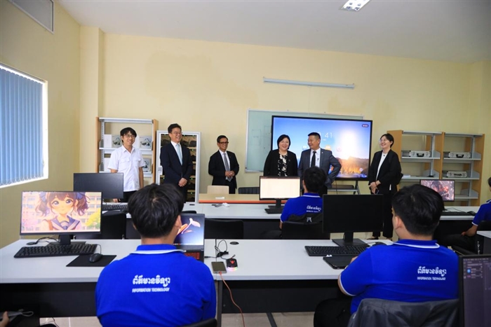 本网讯(柬埔寨亚龙丝路学院通讯员 甘术恩)4月1日,中国教育国际交流协会秘书长杨军一行赴合作院校柬埔寨国家技术培训学院访问,并参观了温州职业技术学院亚龙丝路学院(以下简称“丝路学院”)。柬埔寨国家技术培训学院校长约克·索提(Yok Sothy),副校长埃克·潘纳兰(Ek Phannarann)、莫姆·索玛奇(MOM SOMACH)及相关部门负责人,我校丝路学院两名公派教师全程陪同访问。